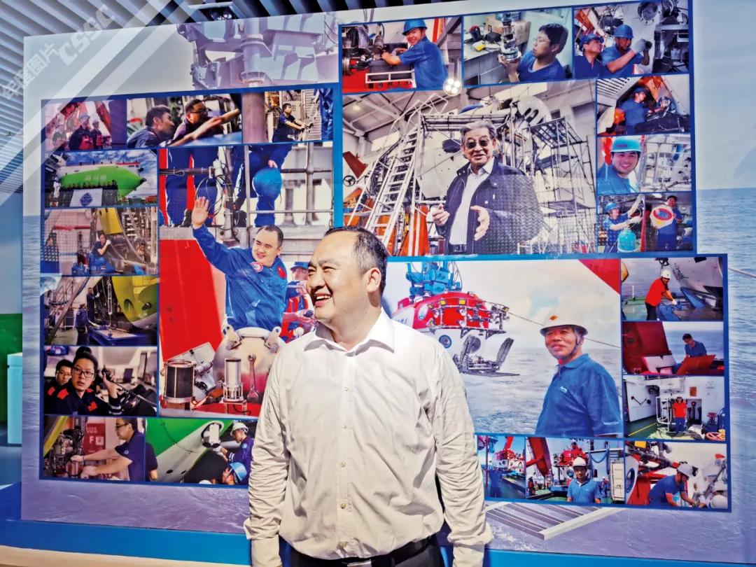 國企開放日期間, “奮斗者”號總設(shè)計師葉聰帶領(lǐng)眾多央媒記者走進(jìn)中國船舶、深入船人一線,感受大國重器的張力!在展覽室的背景墻前,他縱然一笑,撒下江湖傳說。
