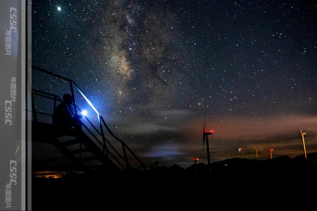 星幕下,中國船舶人在重慶中國海裝南天門風(fēng)電場的漫天星空下,仰望星空,看著風(fēng)機(jī)上的航空燈和璀璨的星河遙相呼應(yīng),這一切簡直美得妙不可言!