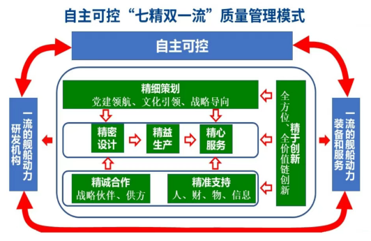七一一所構(gòu)建的“自主可控‘七精雙一流’質(zhì)量模式”,以?xún)?nèi)外雙循環(huán)為驅(qū)動(dòng),通過(guò)“七精”過(guò)程,達(dá)到“雙一流”目標(biāo),確保提供具有一流戰(zhàn)斗力標(biāo)準(zhǔn)的裝備和服務(wù)結(jié)果,實(shí)現(xiàn)了質(zhì)量管理的持續(xù)改進(jìn)與創(chuàng)新發(fā)展。該模式不僅為行業(yè)提供了成熟的管理借鑒,更通過(guò)重大型號(hào)項(xiàng)目研制和批量供貨的實(shí)踐,帶動(dòng)產(chǎn)業(yè)鏈配套供應(yīng)商踐行正向設(shè)計(jì)理念,建成產(chǎn)學(xué)研深度融合的創(chuàng)新鏈,顯著提升了我國(guó)新型船舶動(dòng)力的綜合研制能力。該模式是七一一所在多年實(shí)踐中,緊密結(jié)合行業(yè)特性和企業(yè)戰(zhàn)略,系統(tǒng)總結(jié)、提煉形成的一套具有鮮明特色的現(xiàn)代化質(zhì)量管理方法體系。該模式的有效運(yùn)行,全面驅(qū)動(dòng)了七一一所在產(chǎn)品質(zhì)量、服務(wù)品質(zhì)、運(yùn)營(yíng)效益、品牌價(jià)值及可持續(xù)發(fā)展能力等方面的顯著提升。