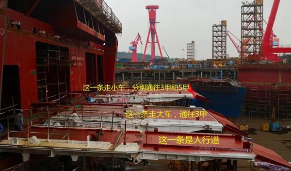 其次,大車(chē)停在3甲車(chē)庫(kù),小車(chē)停在5甲車(chē)庫(kù),可使船舶的重心會(huì)更低、整體更穩(wěn),最重要的是還考慮到港口條件進(jìn)行了量身定做。