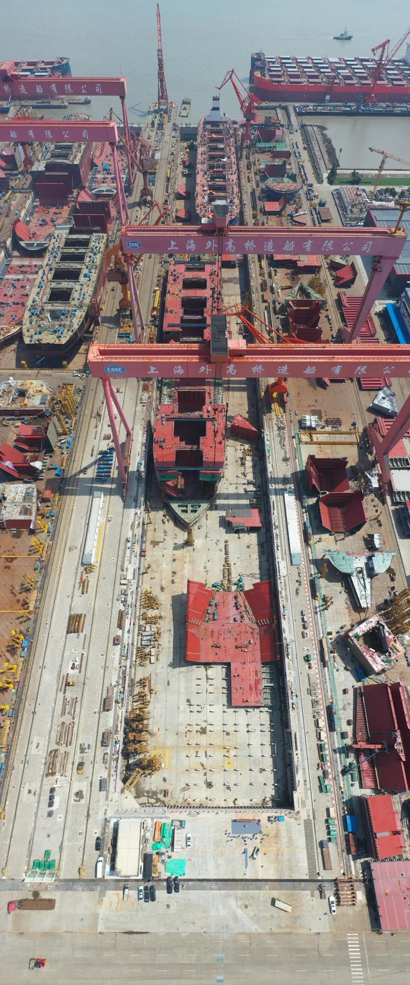 該項改造工程是將現(xiàn)有船塢從540米向陸側(cè)延伸200米,形成長740米、寬76米的“巨無霸”船塢,其周長達(dá)到1.632千米,面積相當(dāng)于7個標(biāo)準(zhǔn)足球場,能同時滿足1艘大型郵輪總組、1艘大型郵輪舾裝的需求,達(dá)到年產(chǎn)1艘半大型郵輪的建造要求。