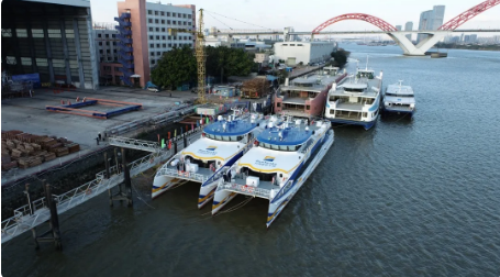 2020年12月30日,中國船舶集團(tuán)旗下遠(yuǎn)舟公司所屬英輝南方造船(廣州番禺)有限公司建造的“新海韻”號、“新海駿”號兩艘鋁合金雙體高速客船,同時(shí)在廣州市番禺區(qū)英輝南方碼頭順利交付?!靶潞m崱?、“新海駿”是英輝南方為船東建造的藍(lán)色干線系列高速客船的第8和第9艘,船長42.8米,寬10.3米,載客199人,設(shè)計(jì)航速35節(jié)。遠(yuǎn)舟公司所屬英輝南方在鋁合金高速客船第三代船型基礎(chǔ)上,開展技術(shù)創(chuàng)新和船型優(yōu)化,開發(fā)完成了“新海韻”、“新海駿”為代表的第四代新船型。