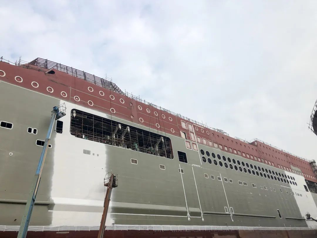 該船實(shí)現(xiàn)了出塢前上建亮燈。電纜拉放完成率87.8%,作為全球最大的豪華客滾船,該船全船電纜長度達(dá)到了946公里(相當(dāng)于從廣州到重慶);出塢前已完成了830公里電纜的拉放工作。涂裝完整性實(shí)現(xiàn)突破,該船出塢時(shí)上層建筑上方仍有部分區(qū)域未完成涂裝? 這是因?yàn)樵摯怪备叨纫呀咏?0米,超過了船塢高空車的最大極限。