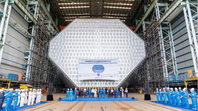 VLEC建造團(tuán)隊(duì)在船東、配套廠商和船級社等各方密切配合下,共同克服新冠肺炎疫情等不利因素,攻克B型液貨艙核心關(guān)鍵技術(shù)難點(diǎn),注重項(xiàng)目管理導(dǎo)向、革新工藝工法、鎳鋼焊接程序、薄板變形控制和優(yōu)化建造流程。從2019年12月底合同簽約到今天首制船的完工交付,總建造周期24個(gè)月,碼頭舾裝周期4個(gè)月,均開創(chuàng)了江南造船大型液化氣船首制船最短周期紀(jì)錄,實(shí)現(xiàn)了復(fù)雜船型節(jié)拍化建造。