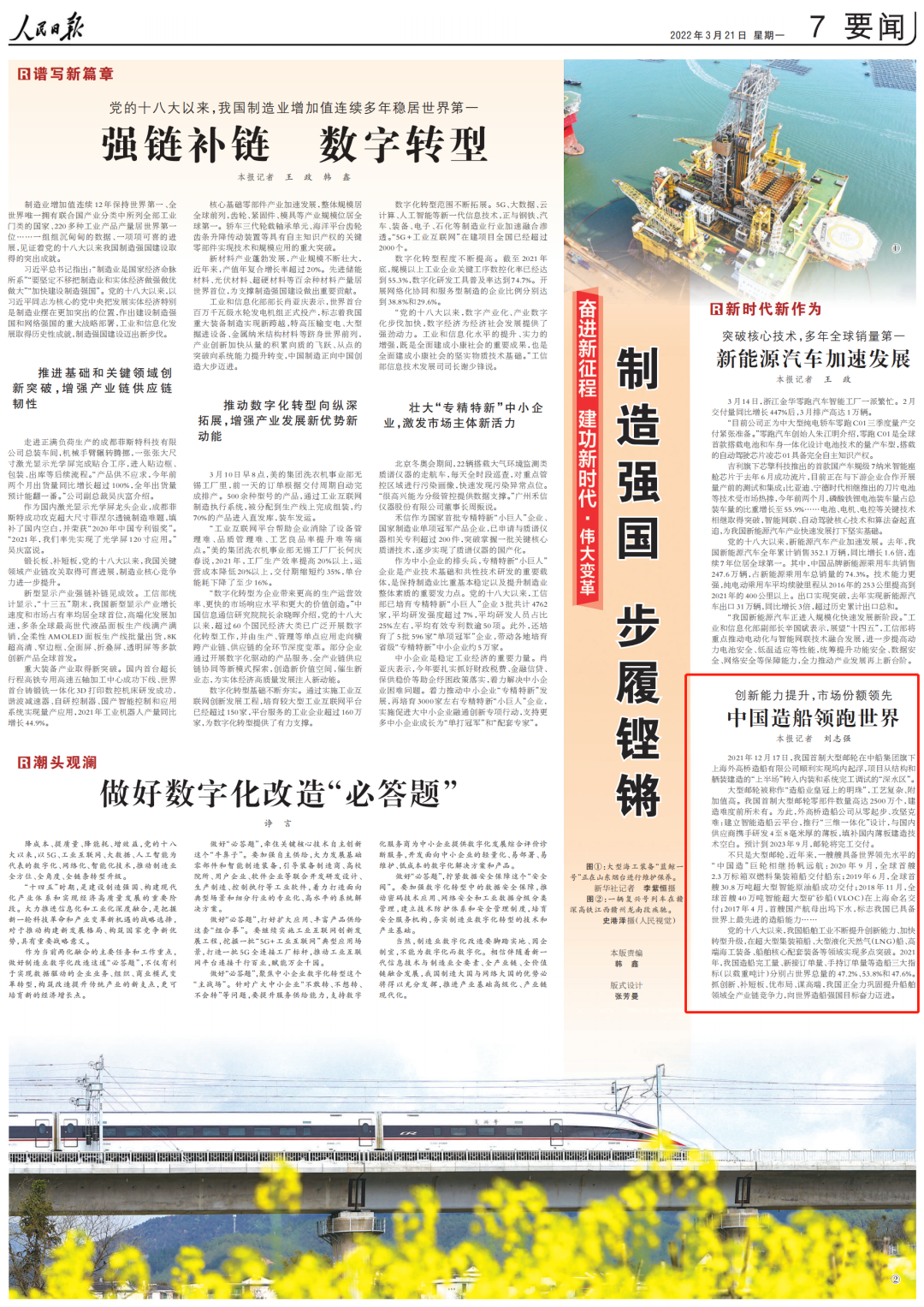 黨的十八大以來,我國船舶工業(yè)不斷提升創(chuàng)新能力、加快轉(zhuǎn)型升級,在超大型集裝箱船、大型液化天然氣(LNG)船、高端海工裝備、船舶核心配套裝備等領(lǐng)域?qū)崿F(xiàn)多點(diǎn)突破。2021年,我國造船完工量、新接訂單量、手持訂單量等造船三大指標(biāo)(以載重噸計(jì))分別占世界總量的47.2%、53.8%和47.6%。抓創(chuàng)新、補(bǔ)短板、優(yōu)布局、謀高端,我國正全力鞏固提升船舶領(lǐng)域全產(chǎn)業(yè)鏈競爭力,向世界造船強(qiáng)國目標(biāo)奮力邁進(jìn)。