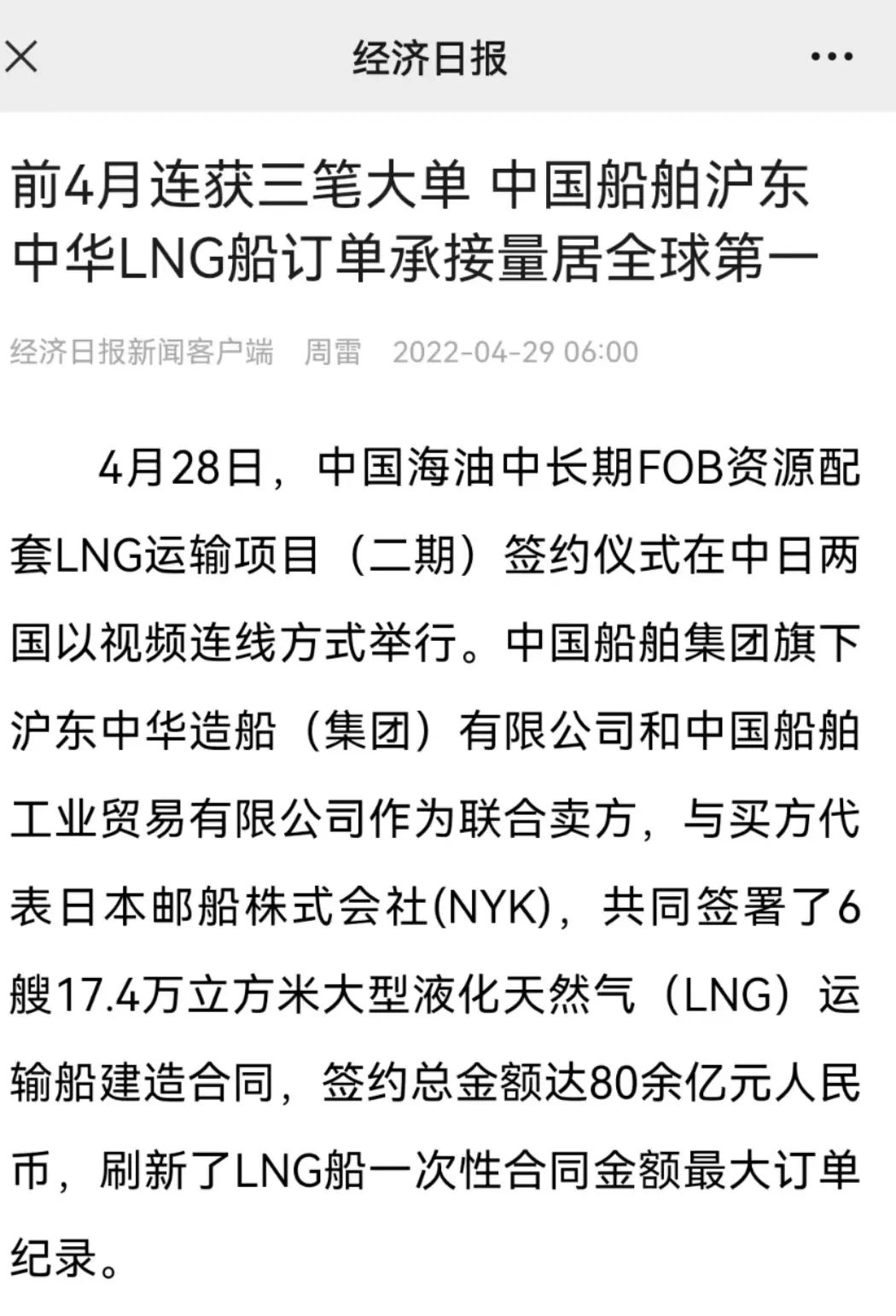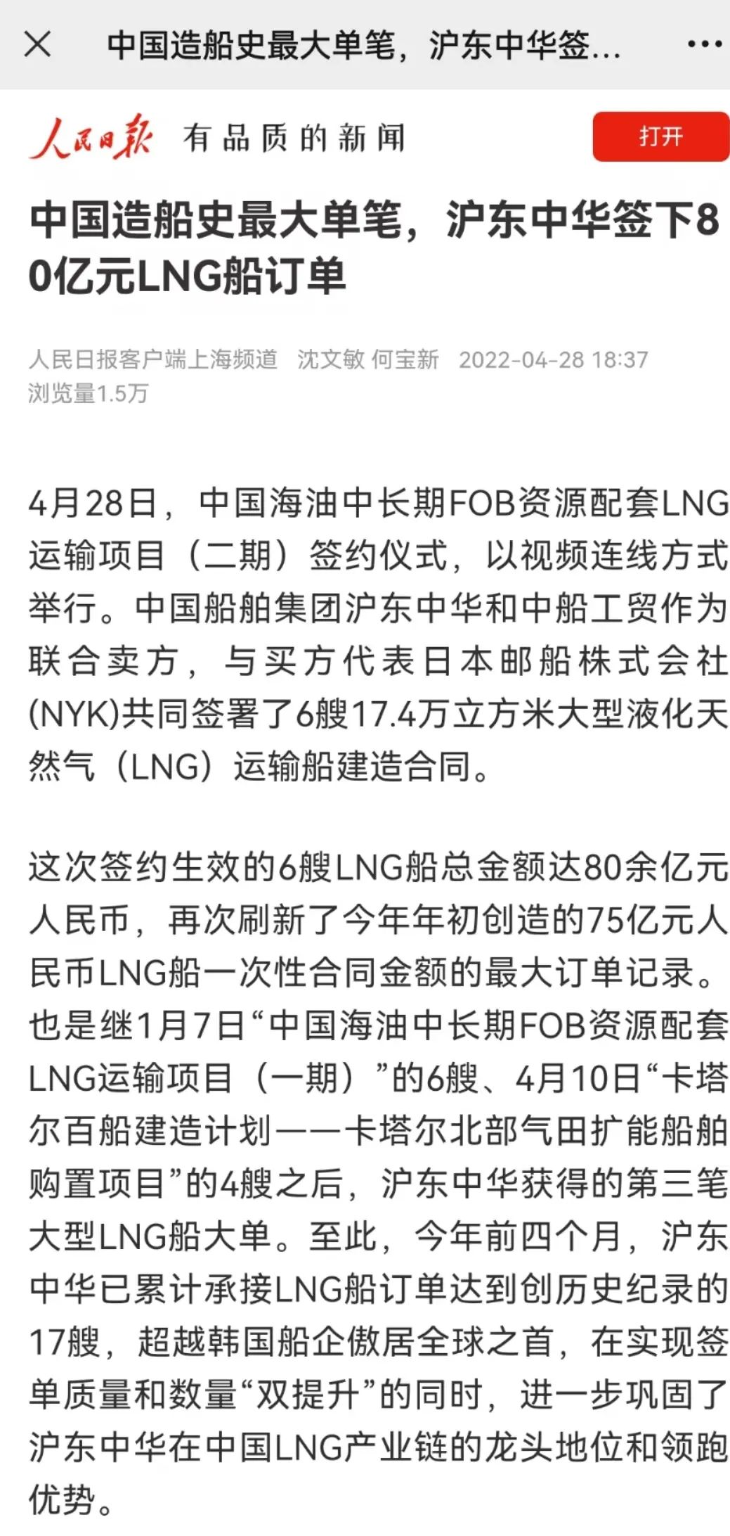 這次簽約生效的6艘LNG船總金額達(dá)80余億元人民幣,再次刷新了今年年初創(chuàng)造的LNG船一次性合同金額最大訂單紀(jì)錄。至此,今年前4個(gè)月滬東中華已累計(jì)承接LNG船訂單達(dá)到創(chuàng)歷史紀(jì)錄的17艘,超越韓國船企傲居全球之首,在實(shí)現(xiàn)簽單質(zhì)量和數(shù)量“雙提升”的同時(shí),進(jìn)一步鞏固了滬東中華在中國LNG產(chǎn)業(yè)鏈的龍頭地位和領(lǐng)跑優(yōu)勢。