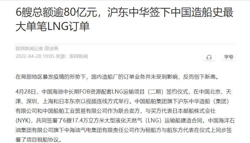 4月28日,中國海油中長期FOB資源配套LNG運(yùn)輸項(xiàng)目(二期)簽約儀式,在中國北京、天津、深圳、上海和日本東京以視頻連線方式成功舉行。中國船舶集團(tuán)有限公司旗下滬東中華和中船貿(mào)易作為聯(lián)合賣方,與買方代表日本郵船株式會社(NYK),共同簽署6艘17.4萬立方米大型液化天然氣(LNG)運(yùn)輸船建造合同。