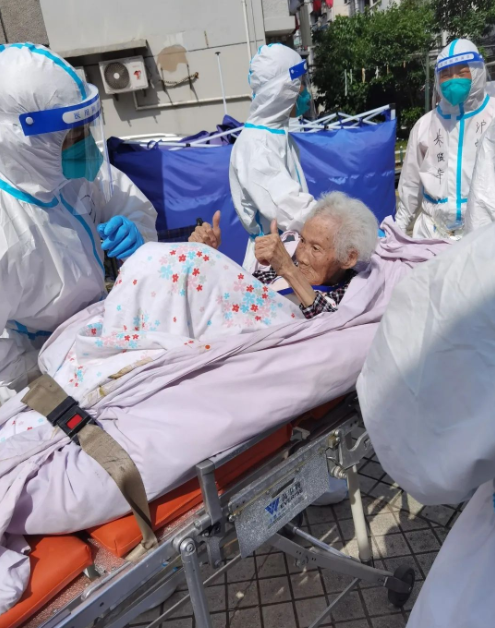 “我們是穿著防護服進去的,突然看到這么多‘大白’,老人們不免有些緊張,問的最多的就是‘去哪里’。隨著我們一趟趟幫著老人下樓、上車,老人們開始逐漸信任我們。因為轉(zhuǎn)運的部分老人中存在核酸異常的情況,有些老人還會時不時關(guān)照我們要注意防護。幫他們送上救護車時,老人還和我們連聲表示感謝?!碧镅┟髡f道。