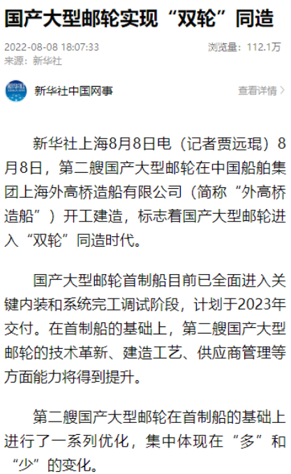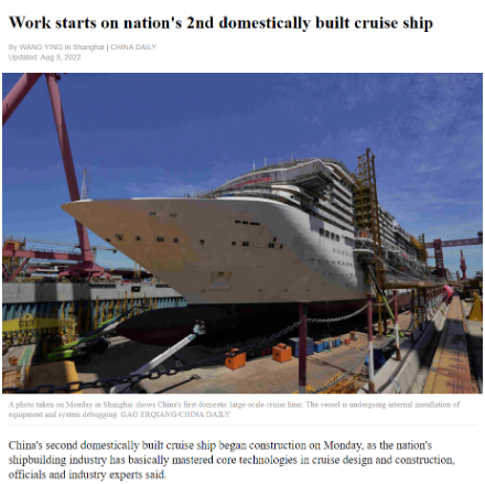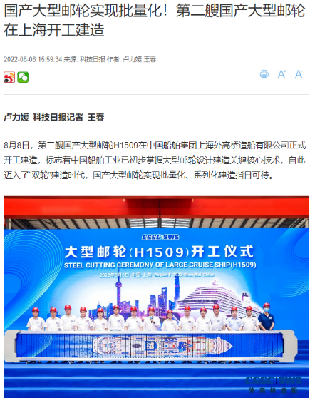 8月8日,第二艘國產(chǎn)大型郵輪在中國船舶集團旗下外高橋造船開建,這標志著中國船舶工業(yè)已初步掌握大型郵輪設計建造關鍵核心技術。