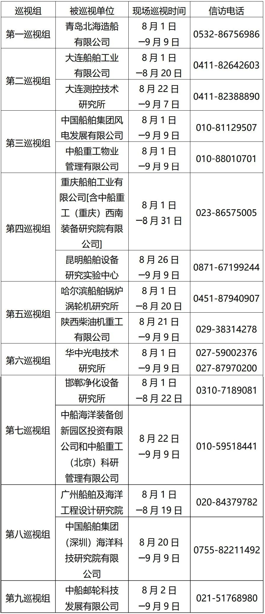 根據(jù)中國船舶集團(tuán)黨組2022年第一輪巡視工作部署,截至2022年8月2日,中國船舶集團(tuán)黨組9個(gè)巡視組已進(jìn)駐青島北海造船有限公司、大連船舶工業(yè)有限公司、中國船舶集團(tuán)風(fēng)電發(fā)展有限公司、中船重工物業(yè)管理有限公司、重慶船舶工業(yè)有限公司[含中船重工(重慶)西南裝備研究院有限公司]、哈爾濱船舶鍋爐渦輪機(jī)研究所、華中光電技術(shù)研究所、邯鄲凈化設(shè)備研究所、廣州船舶及海洋工程設(shè)計(jì)研究院、中船郵輪科技發(fā)展有限公司等單位,對其黨組織開展為期40天左右的現(xiàn)場巡視。巡視期間,巡視組設(shè)置專門值班電話(具體如下表)。同時(shí)在巡視組工作現(xiàn)場設(shè)置聯(lián)系信箱,廣大干部職工可以反映情況。