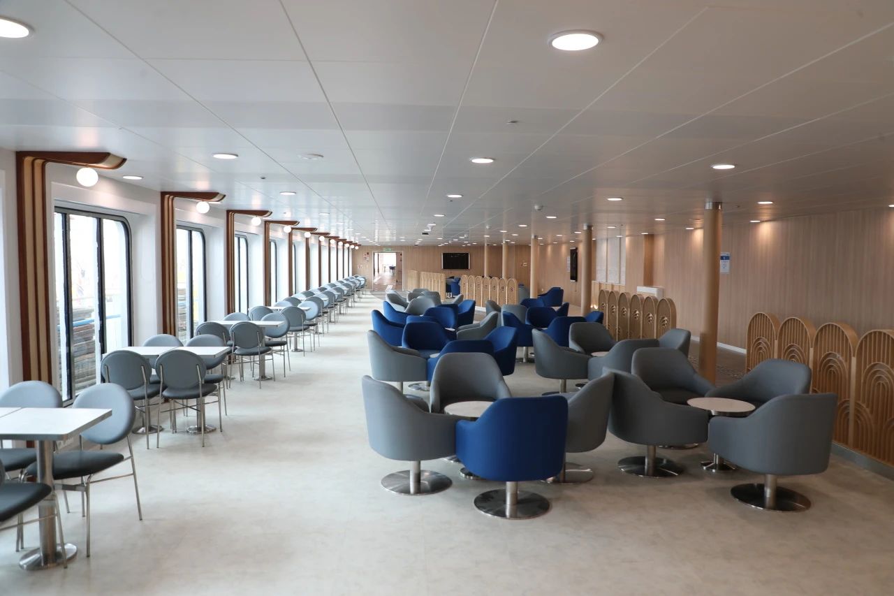 船上可供旅客自由活動(dòng)的公共區(qū)域面積達(dá)到6000平方米,設(shè)計(jì)有自助餐廳、咖啡廳、觀光廳、披薩店、免稅店、航空坐席區(qū)、兒童游樂區(qū)、露天酒吧等休閑娛樂場(chǎng)所。