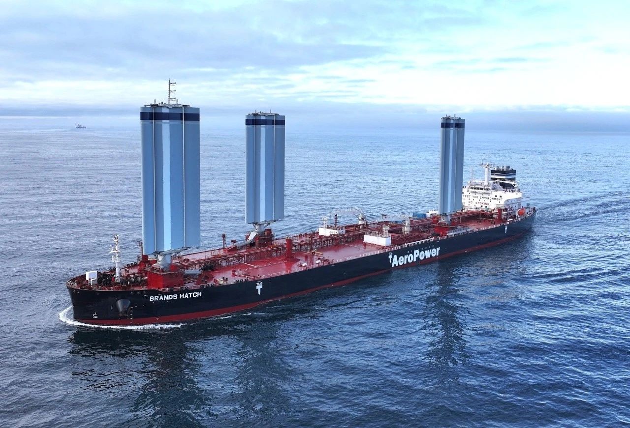 風(fēng)能作為一種可再生能源,以其高性?xún)r(jià)比成為業(yè)內(nèi)研究船舶推力的新方向。“BRANDSHATCH”號(hào)以將傳統(tǒng)風(fēng)能轉(zhuǎn)化為智能化現(xiàn)代推進(jìn)力為核心技術(shù)顛覆點(diǎn),配備三具高度超過(guò)40米的硬質(zhì)翼型風(fēng)帆,在航行中能夠依托數(shù)字控帆系統(tǒng)根據(jù)氣象數(shù)據(jù)實(shí)現(xiàn)實(shí)時(shí)智能動(dòng)態(tài)調(diào)整帆角,通過(guò)機(jī)械液壓傳動(dòng)系統(tǒng)實(shí)現(xiàn)升降、開(kāi)合和旋轉(zhuǎn),為船舶提供額外推力,從而大幅減少主機(jī)的燃油消耗,有效提升船舶運(yùn)營(yíng)效能。